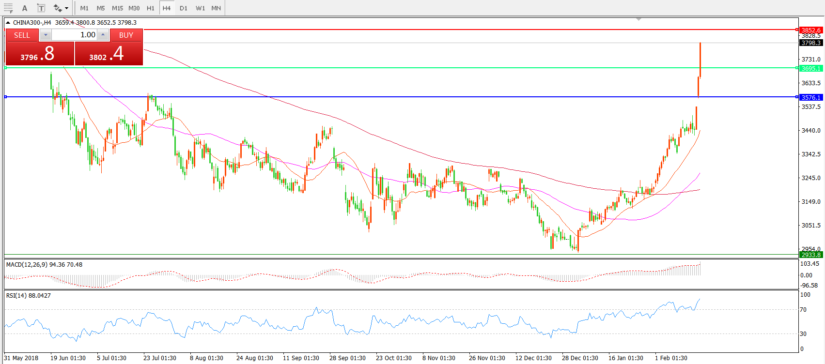 4小时图看,CHINA300中华指数突破阻力后强势上行。光头光脚阳线收盘,整体走势十分强势,均线系统呈多头排列, MACD红柱增加,整体维持偏多思路。