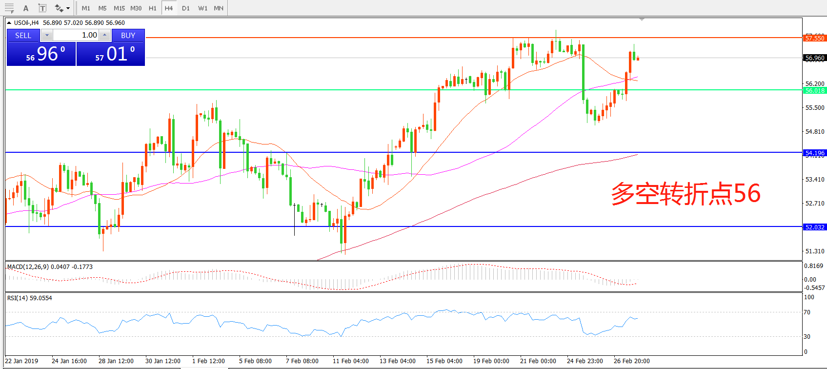 4小时图看,油价回踩55后均线或企稳上行, 21均线逐渐下穿,形成死叉,MACD绿柱减少,红柱增加,日内预计以56-57.5之间震荡为主。