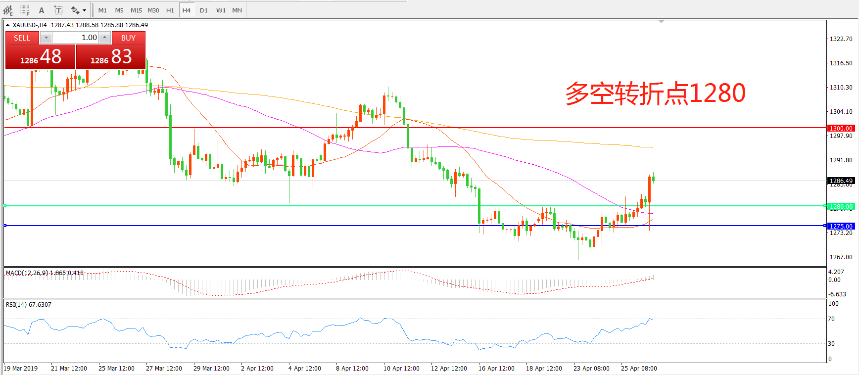 交易策略:在1280.00之上看涨,目标1295.00   1300.00