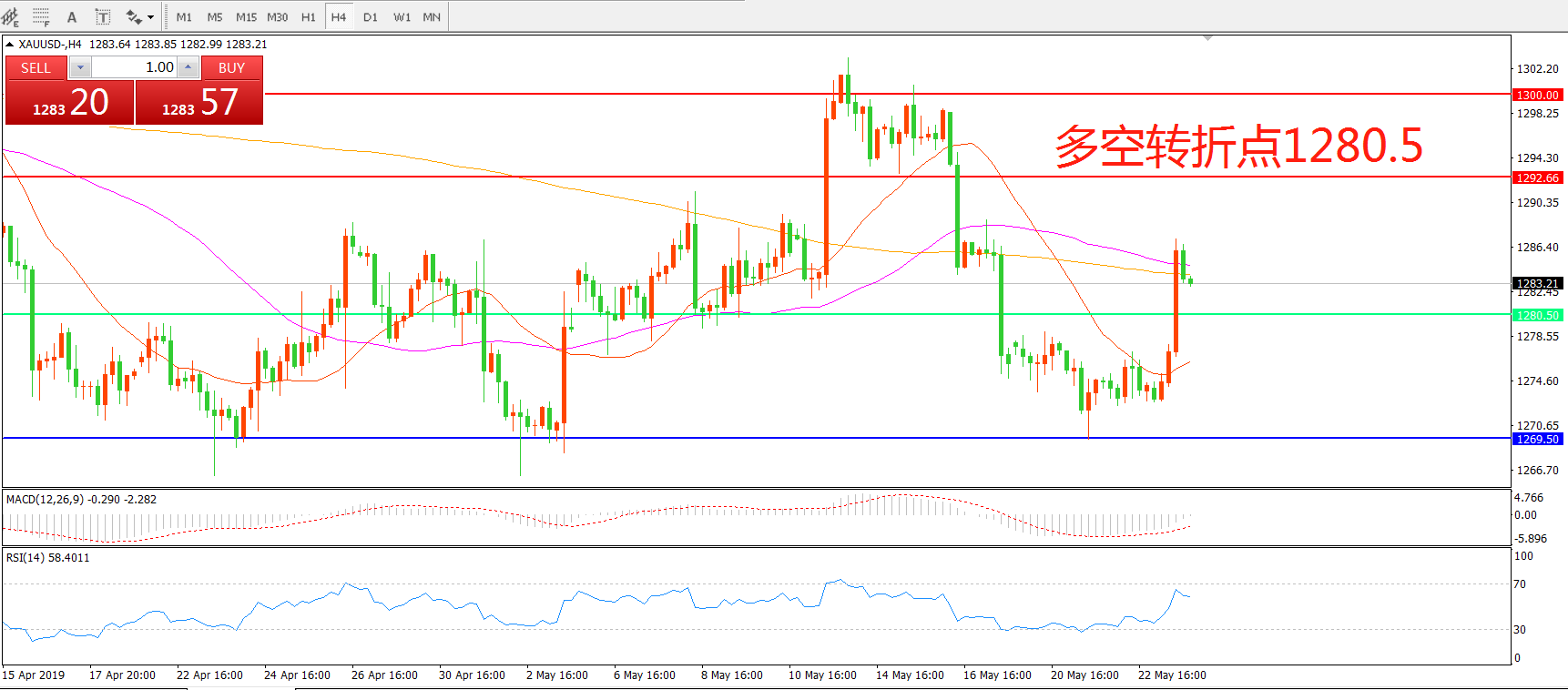 周四(5月23日),中美贸易摩擦继续发酵,欧洲政治经济面临新的不确定性,全球开启避险模式,风险资产纷纷走低,避险资产受到市场青睐。现货黄金价格大幅反弹,收报1283.47美元/盎司。美国5月制造业PMI和4月新屋销售年化月率先后出炉,表现均大幅不及预期。暗示美国经济衰退的风险加剧,后期仍需重点关注美元指数走势。