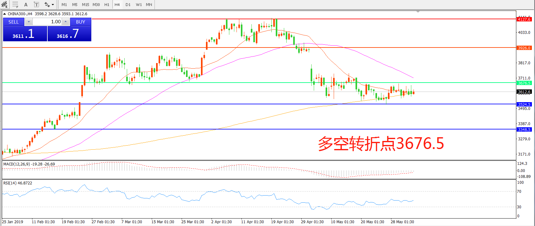 4小时图看,沪深300指数在跌破3676.5后陷入震荡走势,振幅逐渐收窄, 200均线成为短期支撑,MACD绿柱缩短,RSI指标拐头向下,日内以震荡下行思路对待。