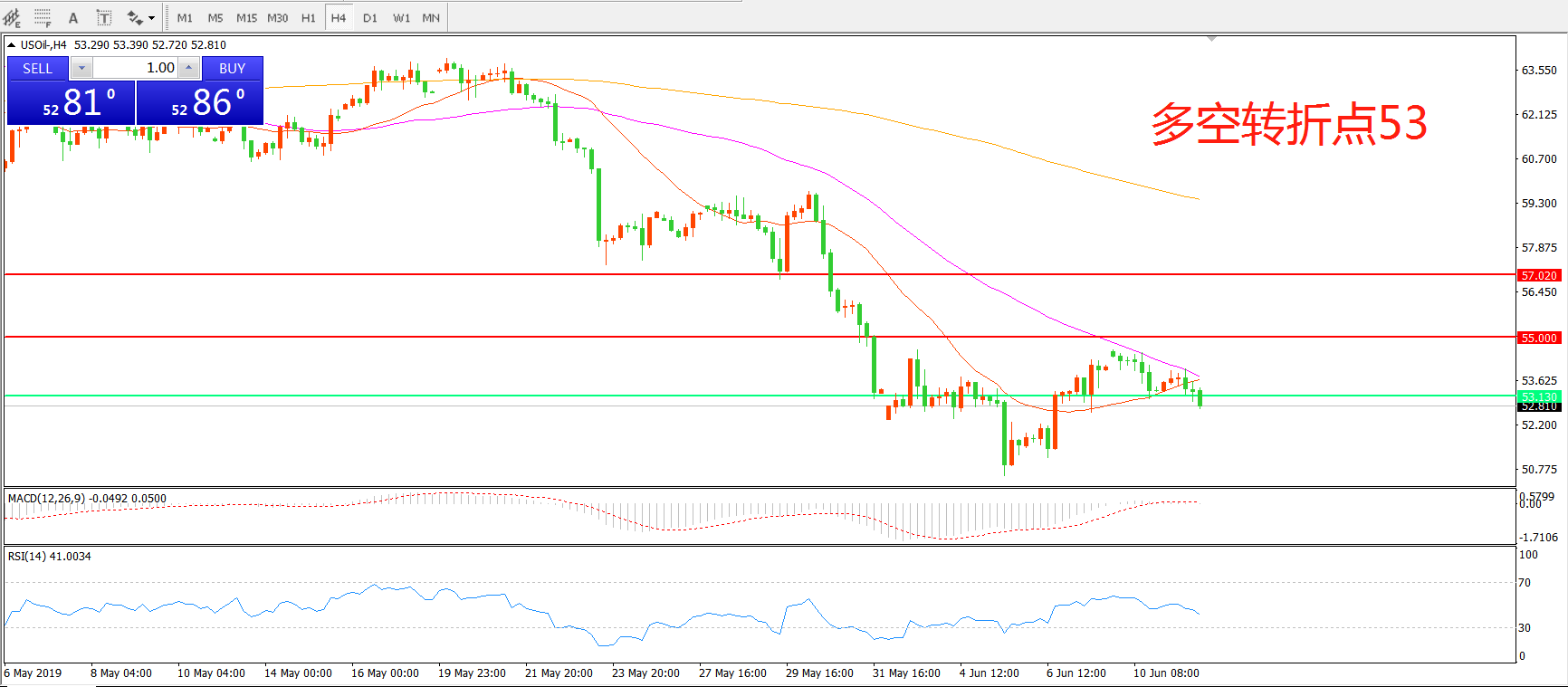 4小时图看,油价触碰55周期均线后震荡回落,短期走势偏空, MACD绿柱减少,均线系统有形成金叉迹象,RSI指标走平,日内仍重点关注53一带得失的多空转化。