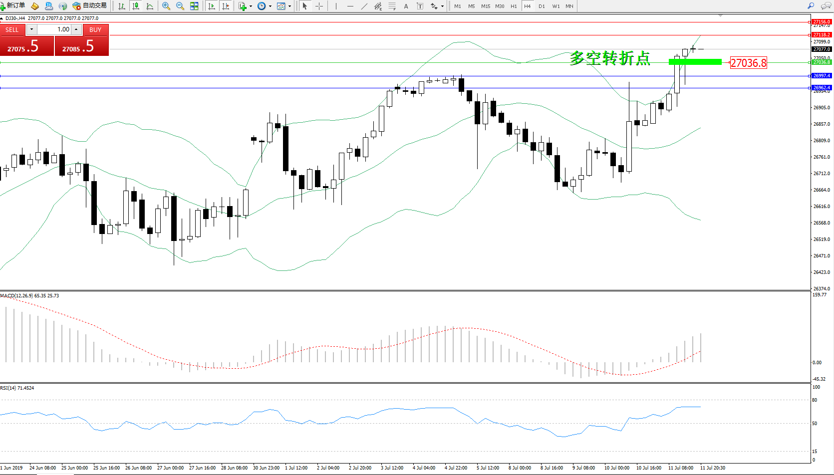 道琼斯指数7月11日(周四)收盘上涨227.90点,涨幅0.85%,报27088.08点。美联储率先放鸽之后,市场预期欧银9月降息概率升至80%。美国6月份CPI创下近一年半年来最大涨幅,但可能不会改变美联储本月将降息的预期。鲍威尔对国会议员表示,美联储将"采取适当行动",保护美国经济免受贸易局势和全球经济增长放缓等日益加剧的风险影响。