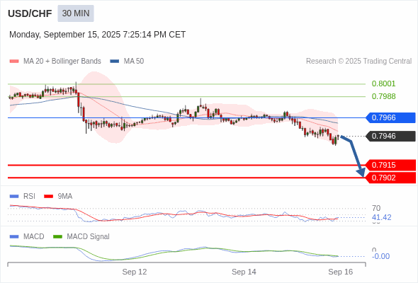 美元/瑞郎 当日内 : 看跌,在 0.7966 之下。