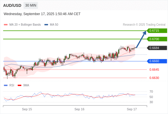 在 0.6660 之上,看涨,目标价位为 0.6700 ,然后为 0.6715 。
