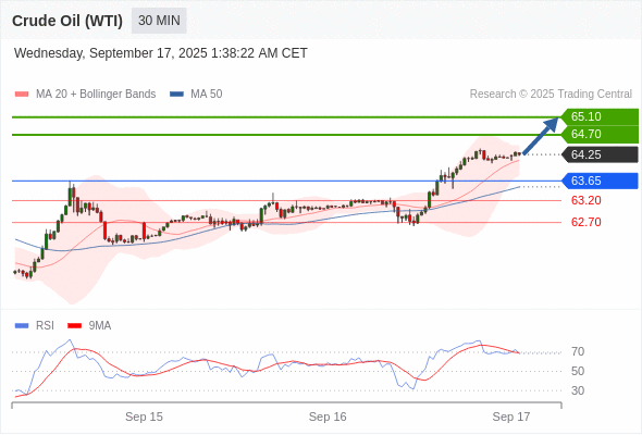 在 63.65 之上,看涨,目标价位为 64.70 ,然后为 65.10 。