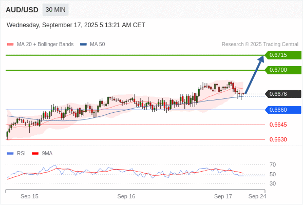 在 0.6660 之上,看涨,目标价位为 0.6700 ,然后为 0.6715 。