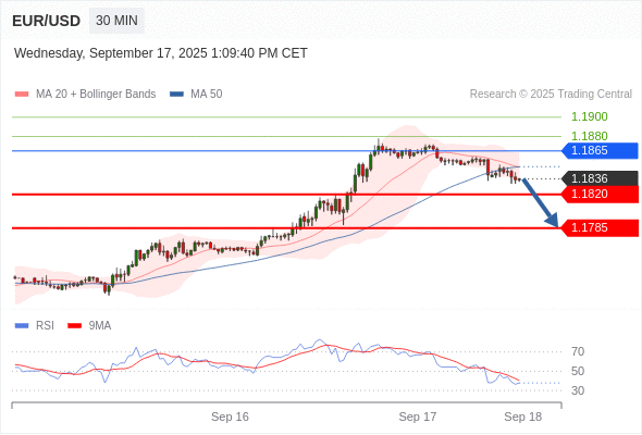 在 1.1865 之下,看跌,目标价位为 1.1820 ,然后为 1.1785 。