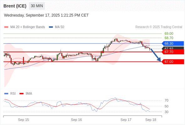 在 68.30 之下,看跌,目标价位为 67.70 ,然后为 67.00 。