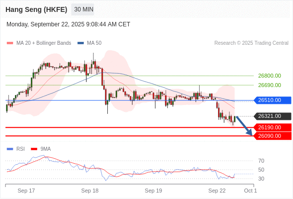 香港恒生指数期货 当日内: 下跌趋势。