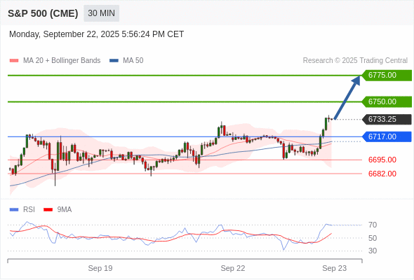 美国标普500指数期货 (Z5) 当日内: 超短线(当日内)支撑位在6717.00附近。