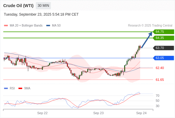 在 63.05 之上,看涨,目标价位为 64.35 ,然后为 64.75 。
