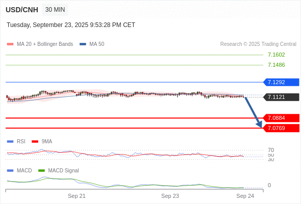 备选策略: 向上突破 7.1292 ,将带来继续上行的趋势,目标位定在 7.1486 和 7.1602 。