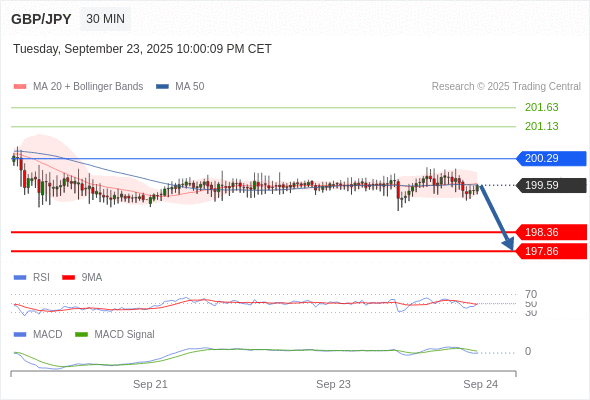 英镑/日元 当日内: 看跌,在 200.29 之下。
