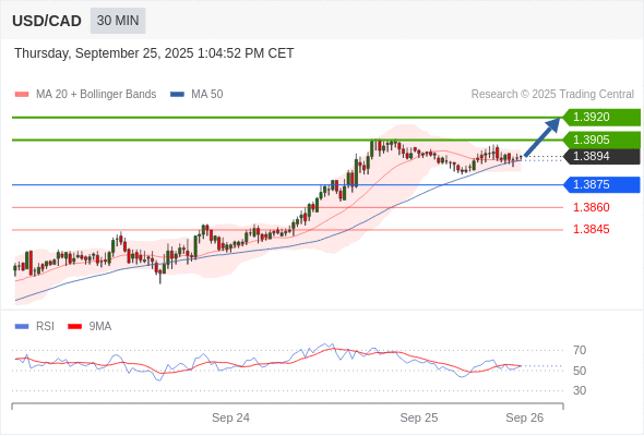 在 1.3875 之上,看涨,目标价位为 1.3905 ,然后为 1.3920 。