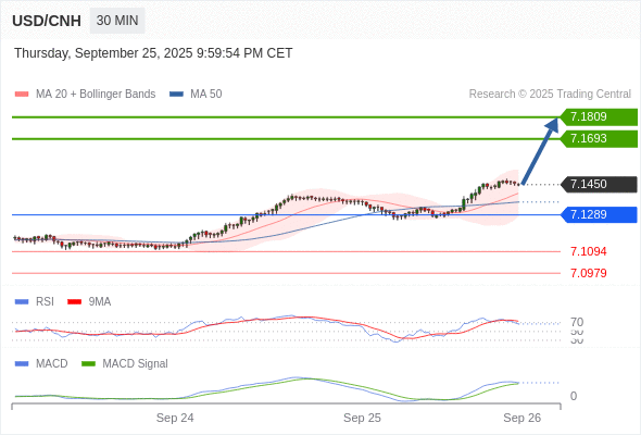 备选策略: 向下跌破 7.1289 ,将带来继续下跌的趋势,目标位为 7.1094 然后为 7.0979 。