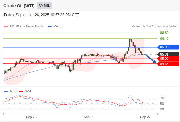 在 65.80 之下,看跌,目标价位为 65.00 ,然后为 64.65 。