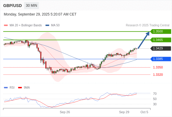 在 1.3385 之上,看涨,目标价位为 1.3465 ,然后为 1.3500 。
