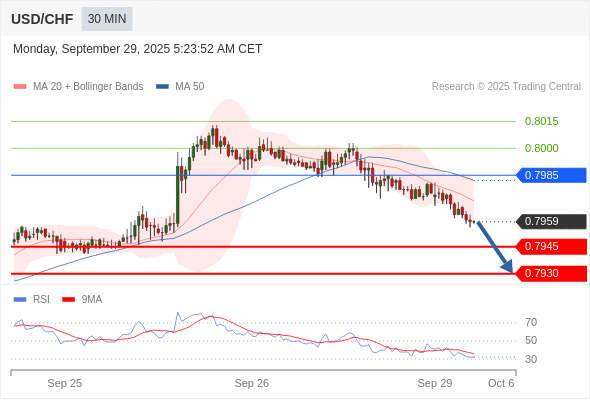 在 0.7985 之下,看跌,目标价位为 0.7945 ,然后为 0.7930 。