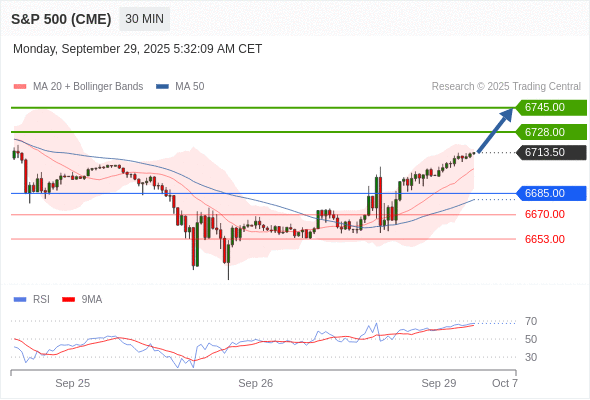 在 6685.00 之上,看涨,目标价位为 6728.00 ,然后为 6745.00 。
