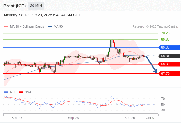 在 69.35 之下,看跌,目标价位为 68.30 ,然后为 67.70 。
