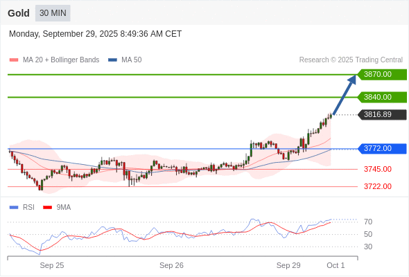 在 3772.00 之上,看涨,目标价位为 3840.00 ,然后为 3870.00 。