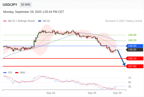 在 148.90 之下,看跌,目标价位为 148.10 ,然后为 147.60 。