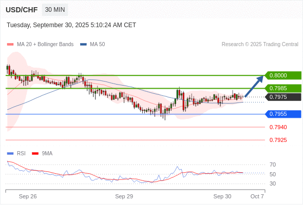 在 0.7955 之上,看涨,目标价位为 0.7985 ,然后为 0.8000 。