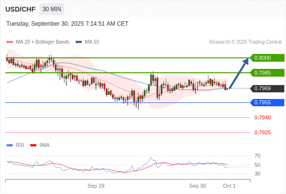 在 0.7955 之上,看涨,目标价位为 0.7985 ,然后为 0.8000 。