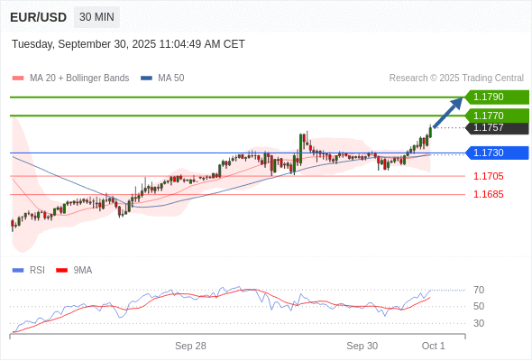 在 1.1730 之上,看涨,目标价位为 1.1770 ,然后为 1.1790 。
