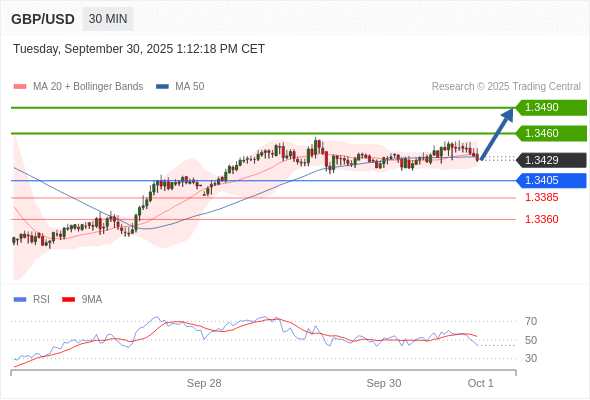 在 1.3405 之上,看涨,目标价位为 1.3460 ,然后为 1.3490 。