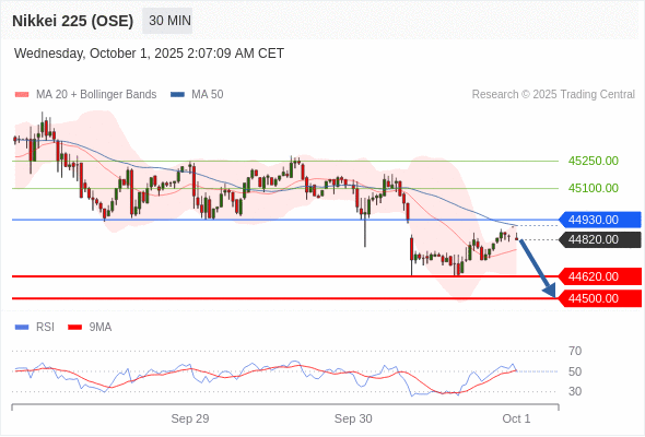 在 44930.00 之下,看跌,目标价位为 44620.00 ,然后为 44500.00 。