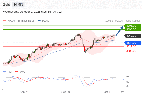 在 3834.00 之上,看涨,目标价位为 3890.00 ,然后为 3905.00 。