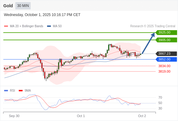 交易策略: 在 3852.00 之上,看涨,目标价位为 3905.00 ,然后为 3925.00 。
