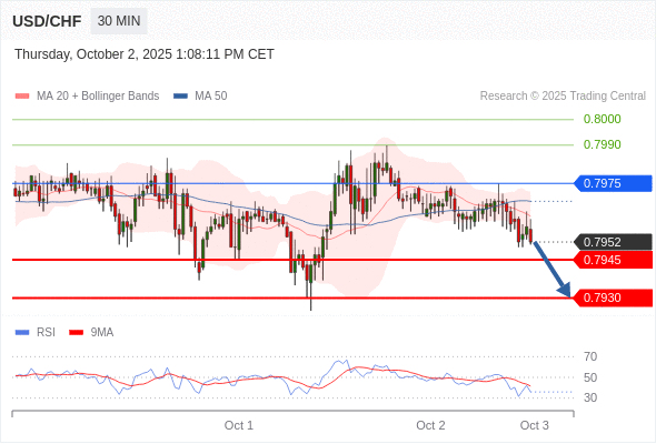 在 0.7975 之下,看跌,目标价位为 0.7945 ,然后为 0.7930 。