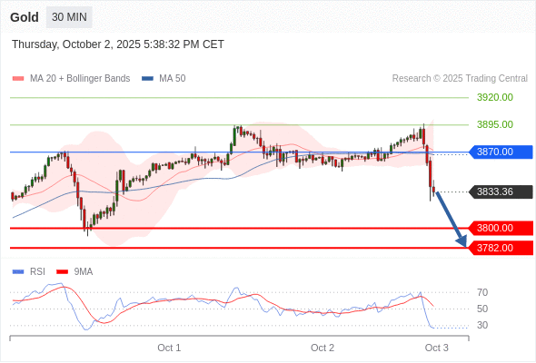 交易策略: 在 3870.00 之下,看跌,目标价位为 3800.00 ,然后为 3782.00 。