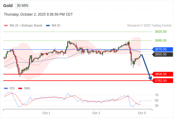 交易策略: 在 3870.00 之下,看跌,目标价位为 3800.00 ,然后为 3782.00 。