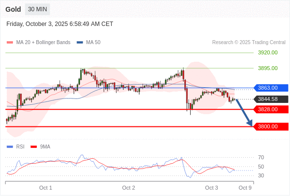 在 3863.00 之下,看跌,目标价位为 3828.00 ,然后为 3800.00 。