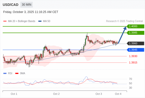 在 1.3945 之上,看涨,目标价位为 1.3985 ,然后为 1.4000 。