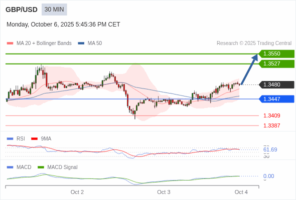 英镑/美元 当日内 : 看涨,当 1.3447 为支撑位。