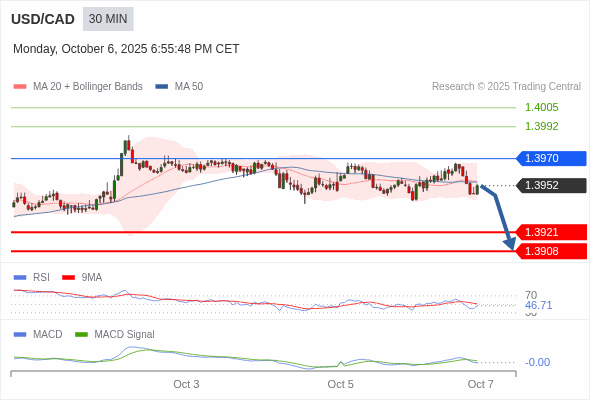 美元/加元 当日内 : 看跌,在 1.3970 之下。