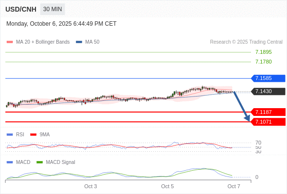 当 7.1585 维持阻力位时,看跌,目标锁定在 7.1071 。