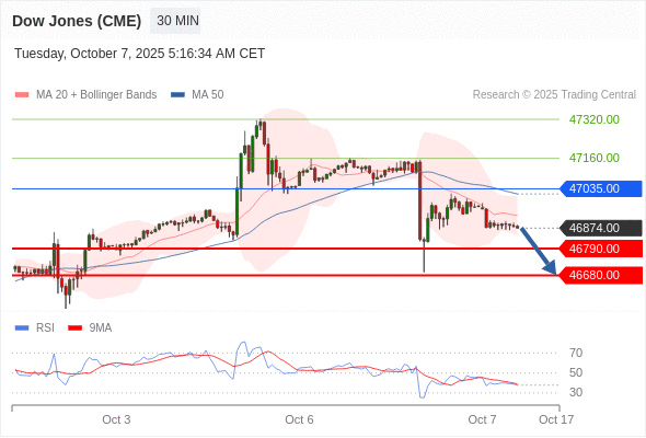 在 47035.00 之下,看跌,目标价位为 46790.00 ,然后为 46680.00 。