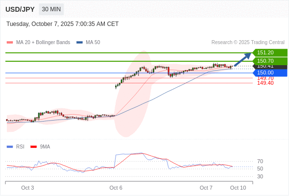 在 150.00 之上,看涨,目标价位为 150.70 ,然后为 151.20 。