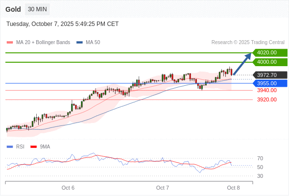 在 3955.00 之上,看涨,目标价位为 4000.00 ,然后为 4020.00 。
