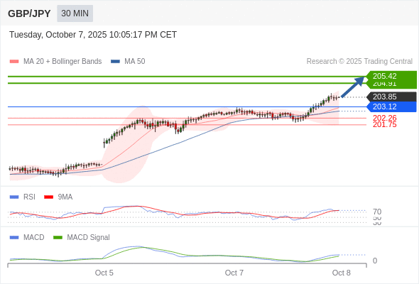英镑/日元 当日内: 看涨,当 203.12 为支撑位。