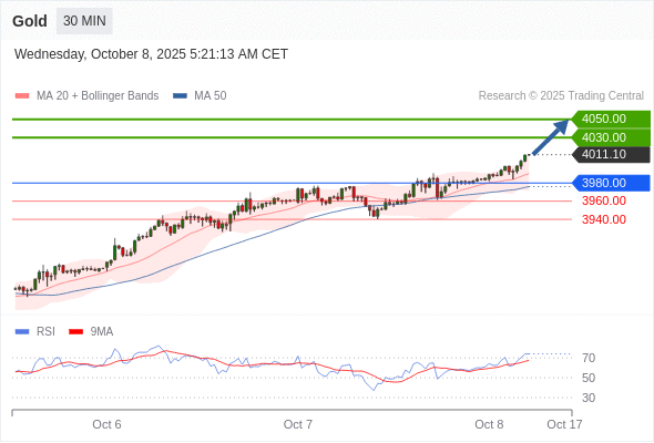 在 3980.00 之上,看涨,目标价位为 4030.00 ,然后为 4050.00 。