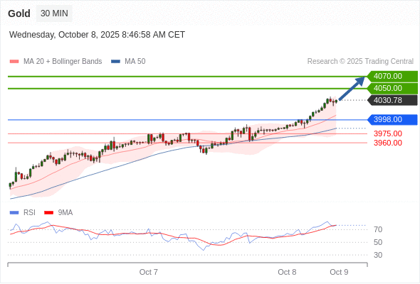 在 3998.00 之上,看涨,目标价位为 4050.00 ,然后为 4070.00 。