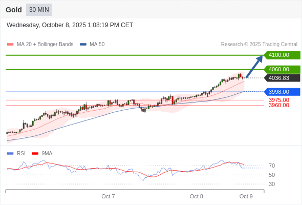 在 3998.00 之上,看涨,目标价位为 4060.00 ,然后为 4100.00 。