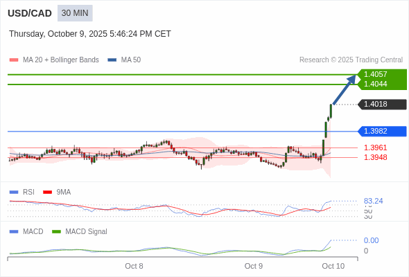 技术点评: RSI技术指标大于70。在这种情况下,说明有很强的上升趋势,或者意味着处在超买的状态下,可能会有向下的调整。我们将观察RSI技术指标是否出现背离现象。 MACD技术指标处在其信号线之上看多。 配置为正。 此外,价位高于其20天及50天移动平均线 ( 分别位于1.3961 和1.3954 )。 最后,价位突破其布林线通道上轨 (位于1.4001。